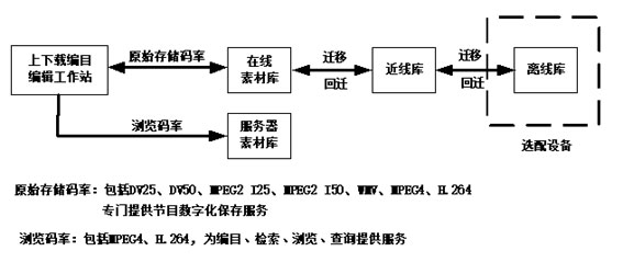 用户在需要各类数据时,数字化节目资料存储系统应能及时输出所需的内容或提供信号。对视音频资料来讲,应该实现包括H.264、MPEG-2-I、MPEG-2-IBP、DVSD、DV25、DV50、MPEG-1、MPEG4、AVI等常用格式的输入输出,而且能够实现对FLV、WMV等格式的支持,实现网络中的发布与点播。