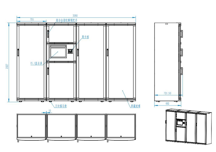 rfid智能柜整机尺寸:3050m m * 721.5m m * 2027m m(长*宽*高)